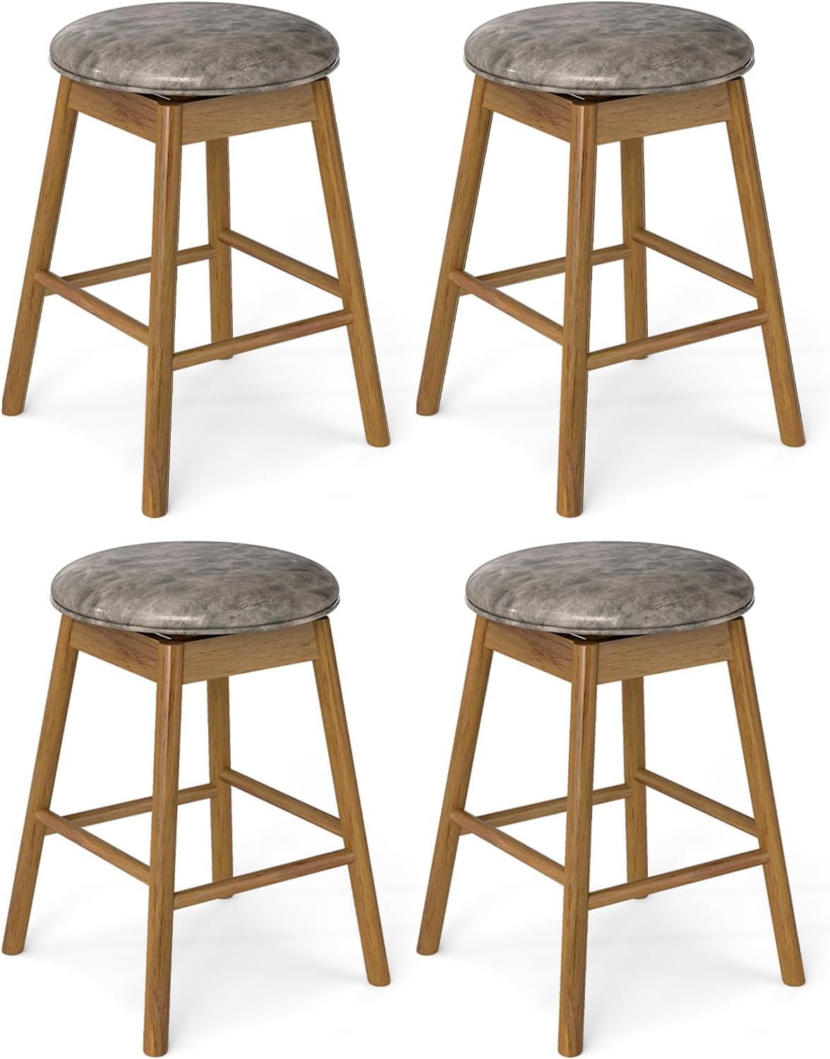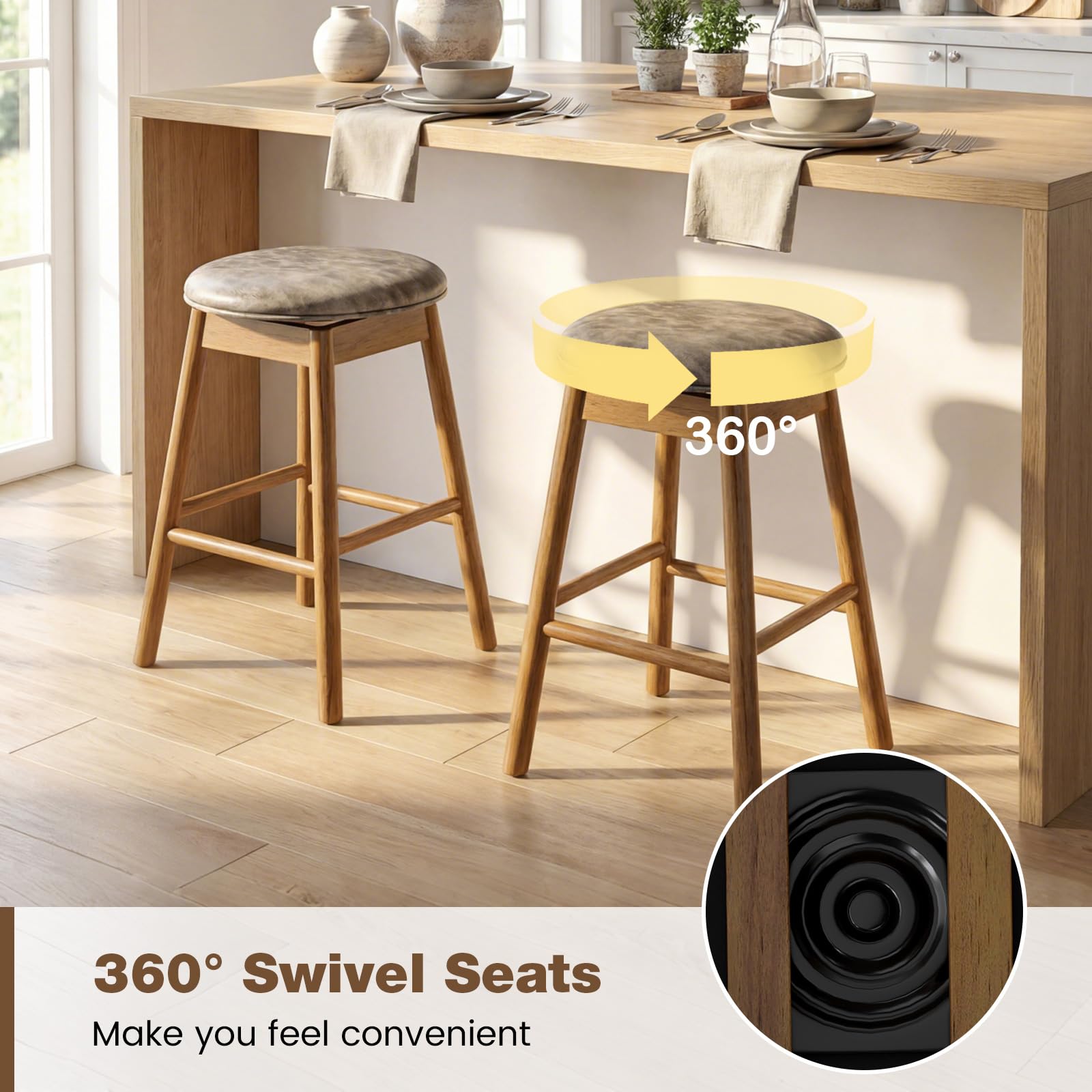 Featuring a smooth 360-degree swivel seat, these breakfast bar stools allow effortless movement and convenience around your breakfast island or counter. The solid rubber wood legs with reinforced crossbars provide stable and reliable support, while their natural wood grain adds a rustic charm to your home. Upholstered with soft padded sponges and high-quality PU leather, these counter stools offer long-lasting comfort. Additionally, built-in footrests ensure proper seating posture. Additionally, the backless design allows for easy storage by tucking the island stools neatly under your counters, saving valuable space.