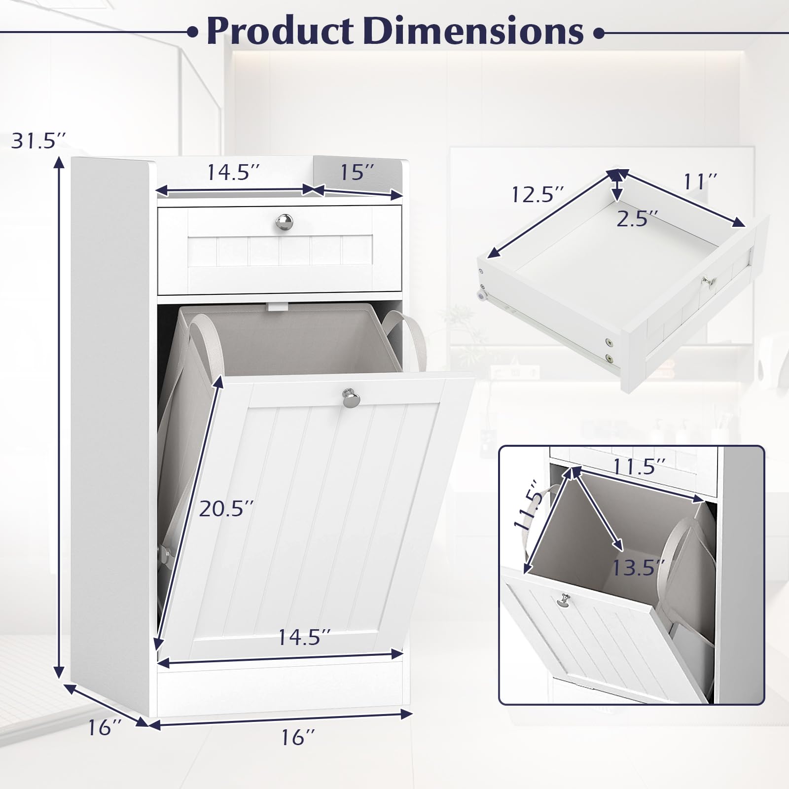 Featuring a drawer and a top shelf with raised edges, this bathroom cabinet offers convenient storage for laundry essentials, while the hidden tilt-out hamper keeps dirty clothes tucked out of view. The hamper compartment includes a removable fabric bag, so that you can easily carry your clothes to the washing machine. Built for daily use, it features smooth metal hinges and slides for long-lasting quality, reinforced panels to support the clothes inside, and an anti-tip kit for added stability. Plus, the wipe-clean finish means upkeep is a breeze. Streamline your routine and keep clutter off the floor with our laundry cabinet!
