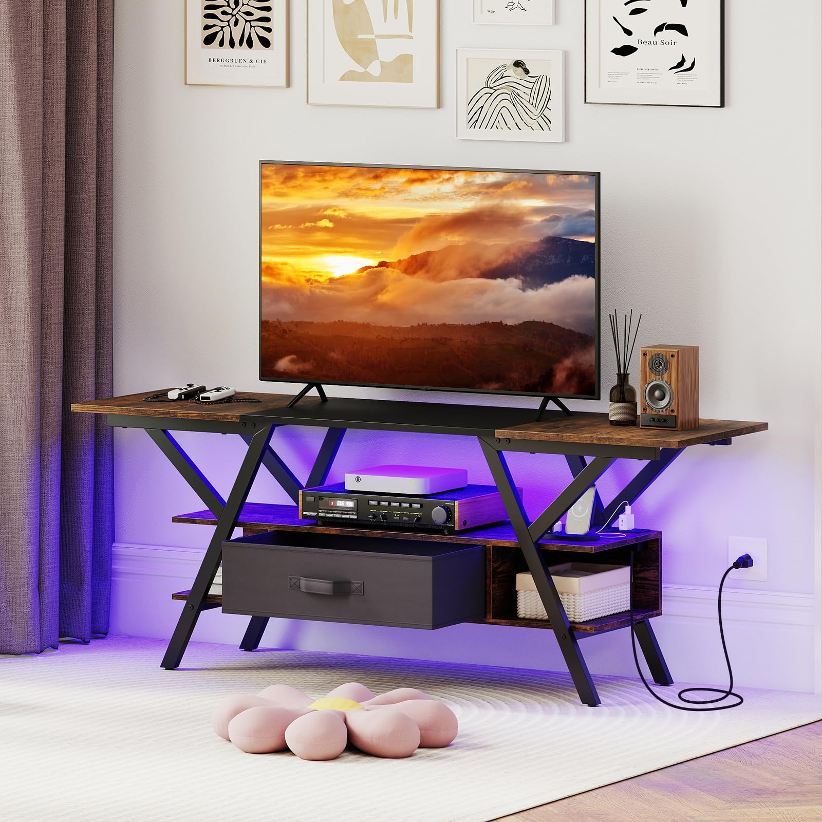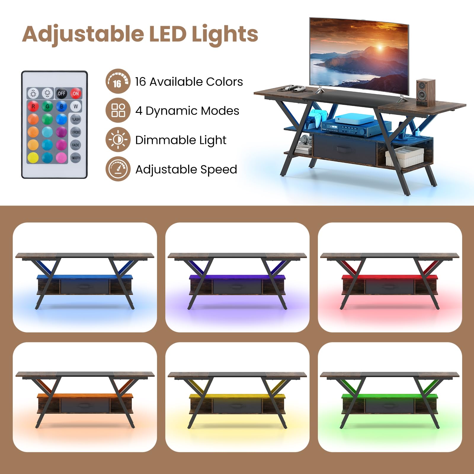 Transform your space with our ultra-modern LED TV stand! Light up your world and watch movies or play games in style. This multifunctional 55” TV stand not only neatly fits up to 65” screens but dazzles with 16 customizable LED colors and dynamic light modes—all controlled with a handy remote. Say goodbye to low batteries and hello to our built-in charging hub—game and charge without the chaos! Featuring robust 3-tier storage and a sleek finish, it’s a showstopper in any dorm, bedroom, or living room. Solid, stylish, and super-functional—make this the centerpiece of your entertainment!