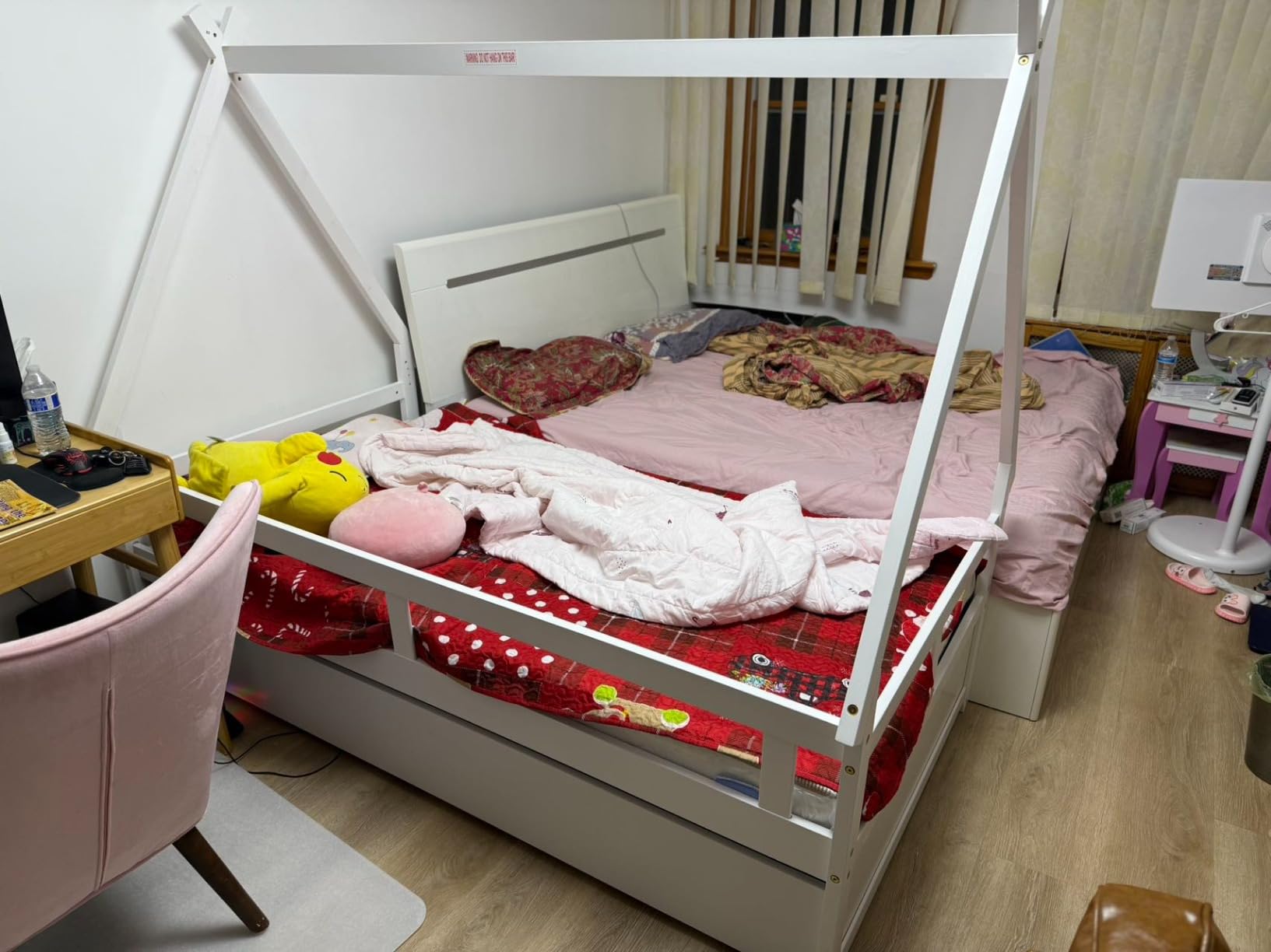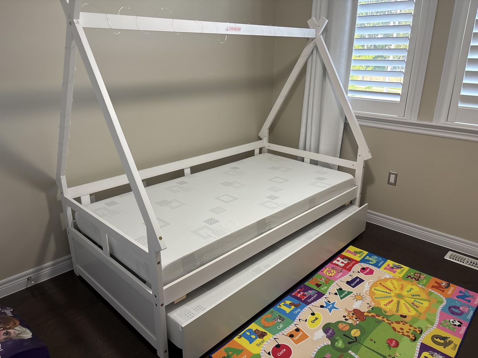 Transform your child’s room into a magical retreat with this enchanting twin daybed! Designed to spark creativity, its charming house-shaped frame is perfect for hanging twinkling lights, airy curtains, or fun ornaments. Glide out the handy trundle with ease for sleepovers or cleverly hide away toys and linens. Crafted from robust wood, this bed is built to withstand the joyful chaos of children’s play. No box spring needed, and with a sturdy guardrail for safety’s the ultimate sleep and play sanctuary for your little one. Ideal for making dreams come true and imaginations soar, this bed is a must-have for any child’s room. Now to bring home the bed that combines fun, function, and fairy tales!