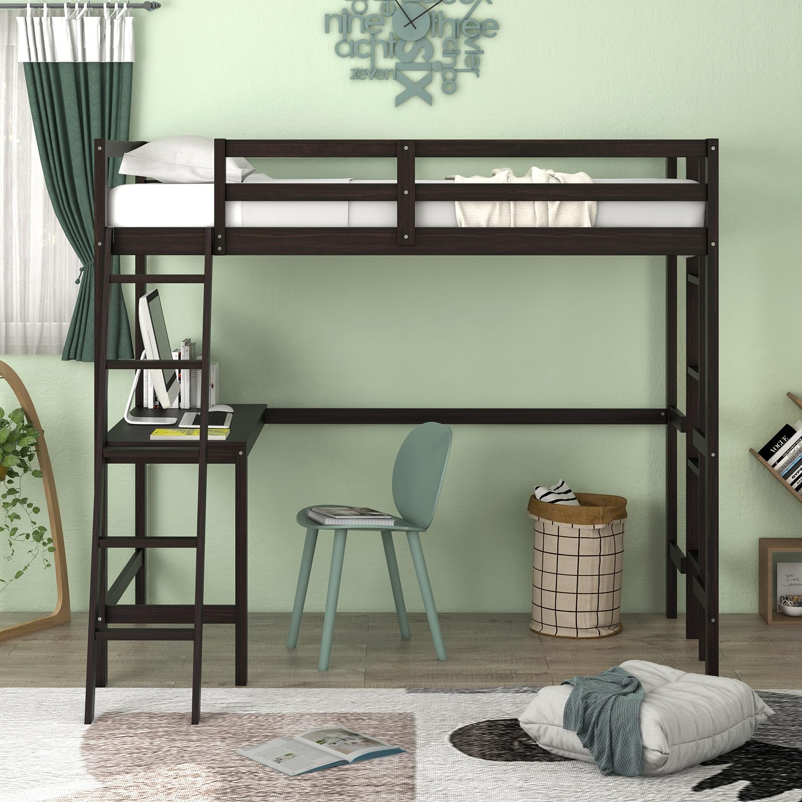 Giantex Twin Size Loft Bed with Desk, Solid Wood Loft Bed with 2 Ladders & Full Length Guardrail