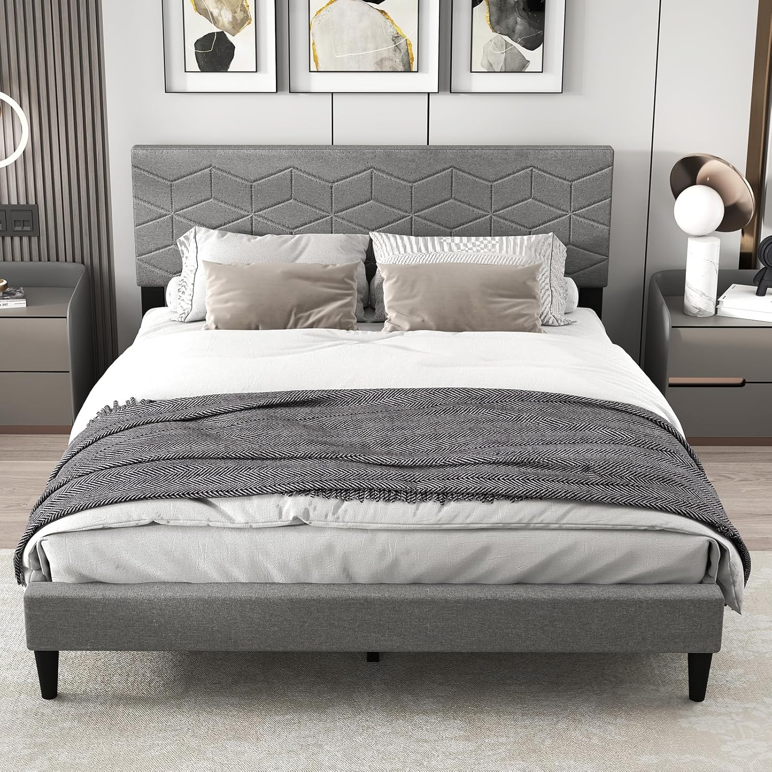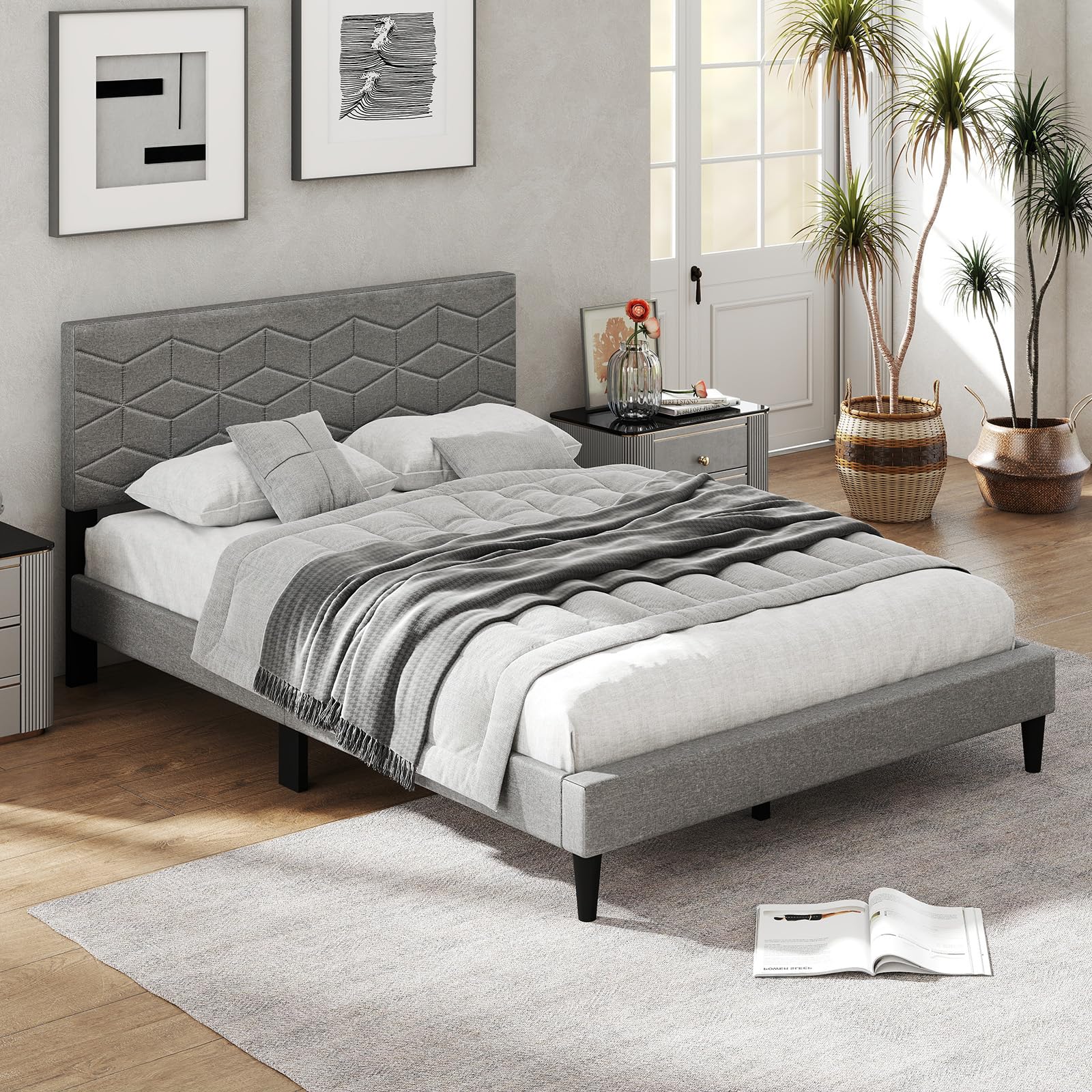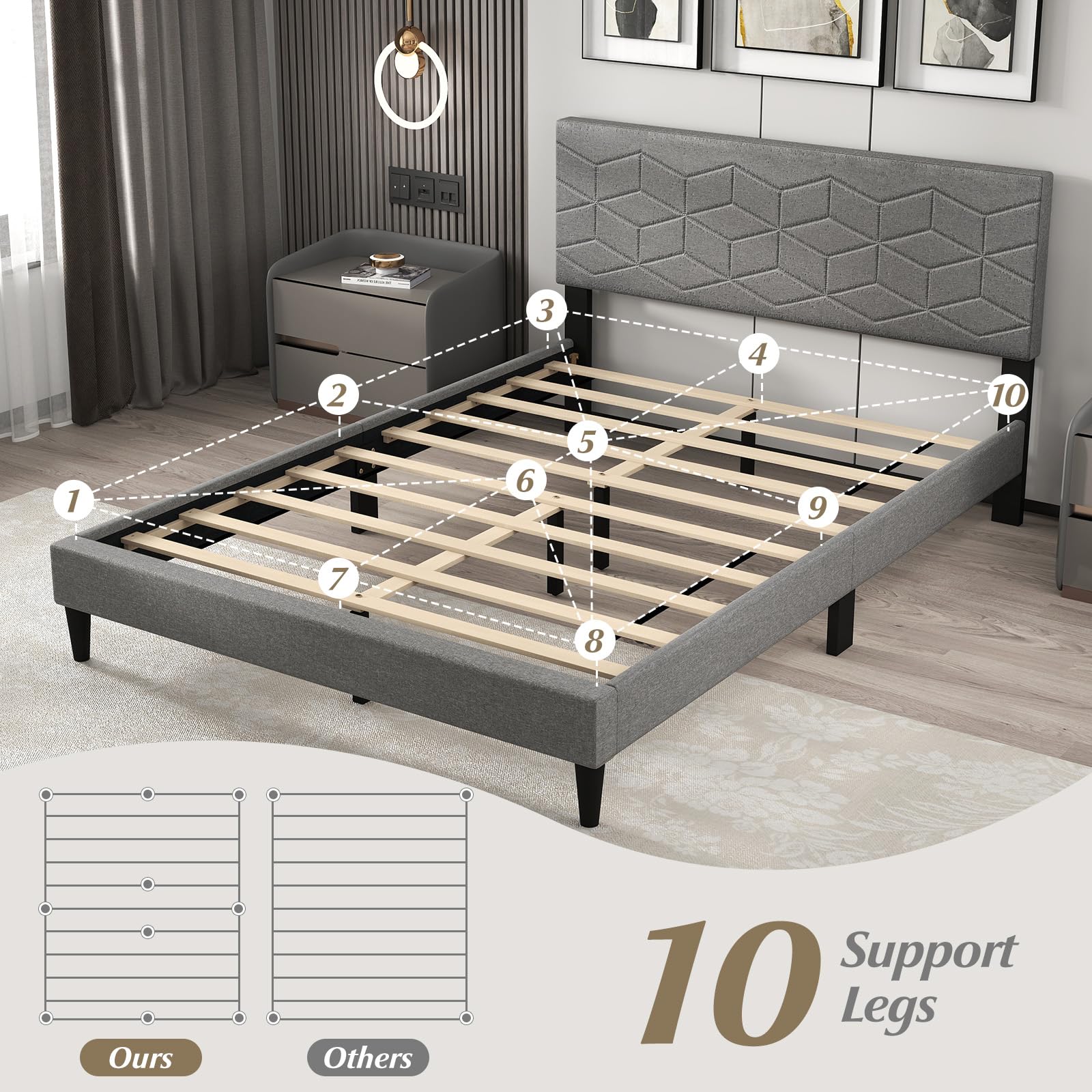 Experience unmatched comfort and elegance with our modern upholstered bed frame. Dive into luxury with a breathable, linen-wrapped headboard perfect for endless relaxing nights. Feel the stability with up to an impressive weight; thanks to our ultra-strong support legs with non-slip pads that ensure a steady, whisper-quiet sleep. Say goodbye to box springs with our money-saving, slatted design that also extends mattress life. Plus, our sleek, low-profile look and easy-clean design add sophistication to any room. Fit for standard 9"-12" thick mattresses, your perfect sleep sanctuary awaits. Transform your bedroom today!