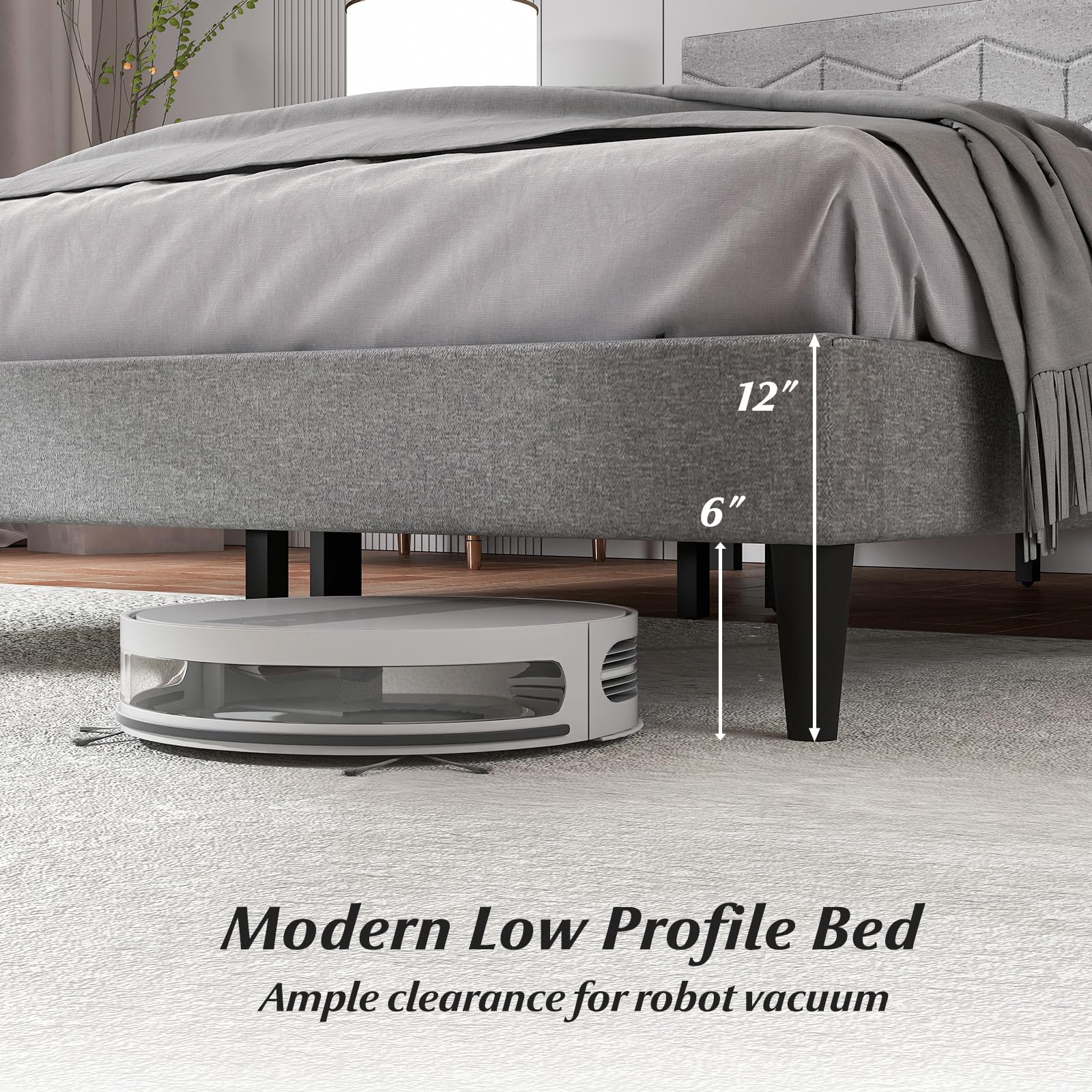 Modern low-profile bed leaves ample clearance for robot vacuum