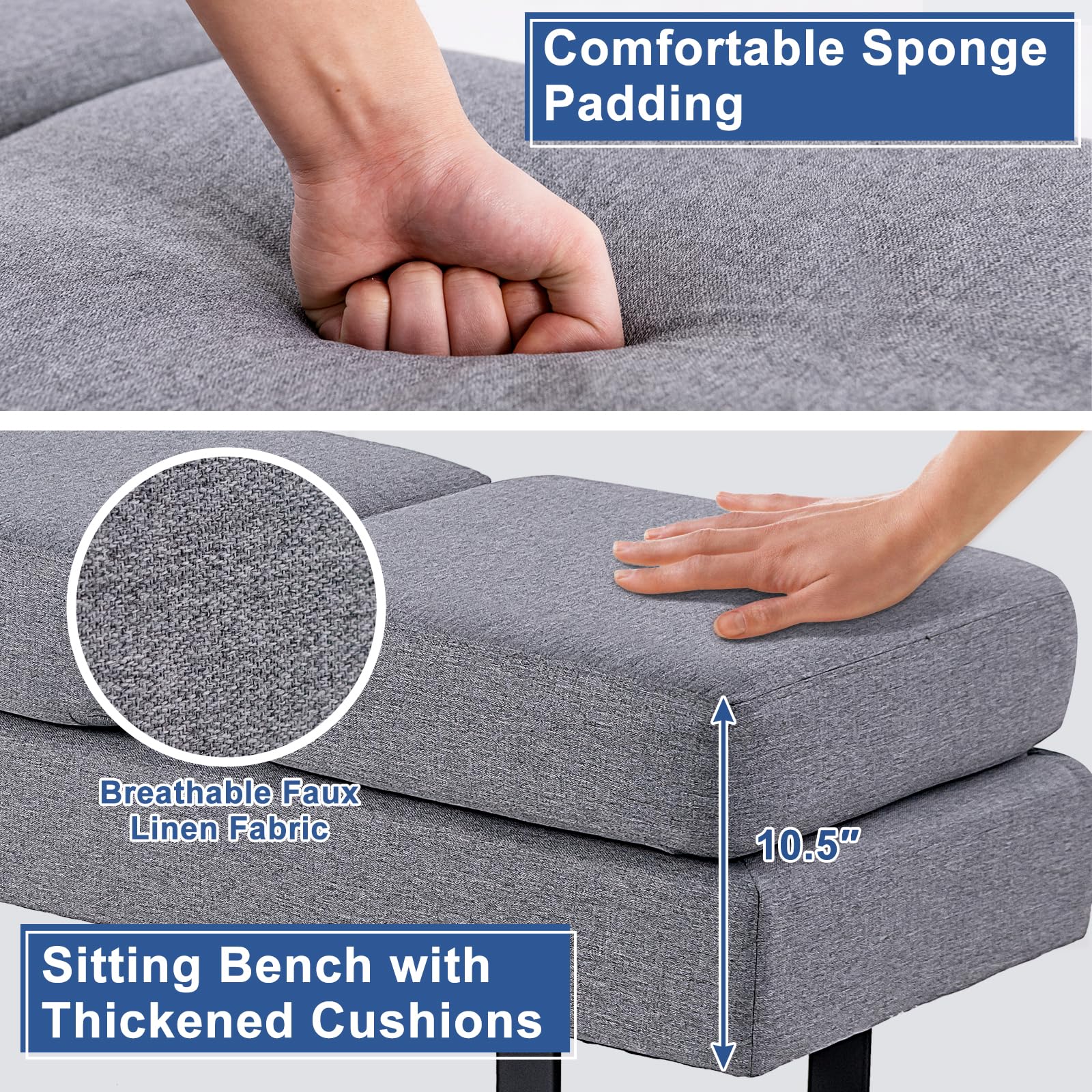 Our classic waiting room bench seating combines timeless style with superior functionality. The sleek design with clean lines brings a modern touch to any interior space, ensuring an elegant atmosphere. With its integrated design, this reception bench office chair offers ample seating space for up to three guests, allowing them to experience exceptional comfort while they wait. The sturdy construction, including heavy-duty metal legs, ensures durability and stability, accommodating multiple users with ease. The high-density sponge padding in the seat cushion provides optimal support and pressure relief, ensuring your guests enjoy the utmost comfort. The faux linen surface adds breathability and a skin-friendly touch, enhancing the overall experience. Can be used as a bed end bench, 3-seat waiting room bench or shoe bench, this multifunctional bench suitable for a variety of scenarios. Elevate your waiting area with our waiting chair today.
