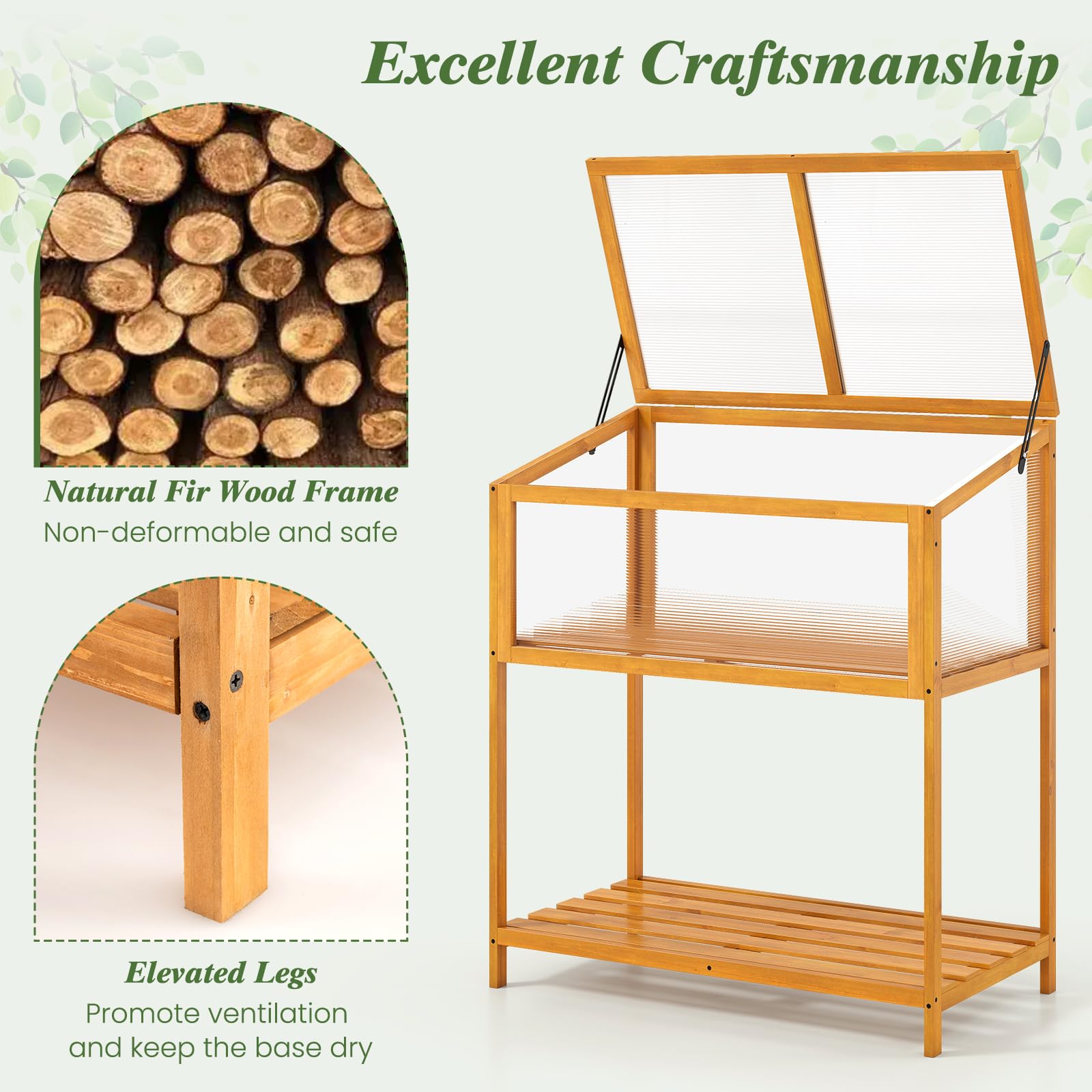 The raised flower planter protection provides optimal conditions for healthy plants across every season. Crafted to a comfortable height to reduce back strain, the cold frame greenhouse is constructed from select fir wood and finished with a water-based coating that preserves its unique grain and enhances durability. The clear roof panels can be adjusted to fine-tune airflow and insulation, establishing an ideal environment that shields delicate seedlings from frost, and fluctuating temperatures, promoting vigorous growth throughout the year. A built-in slatted shelf offers convenient storage for gardening tools and additional space for potted blooms, making the small wood greenhouse an excellent fit for patios, balconies, or indoor sunrooms.