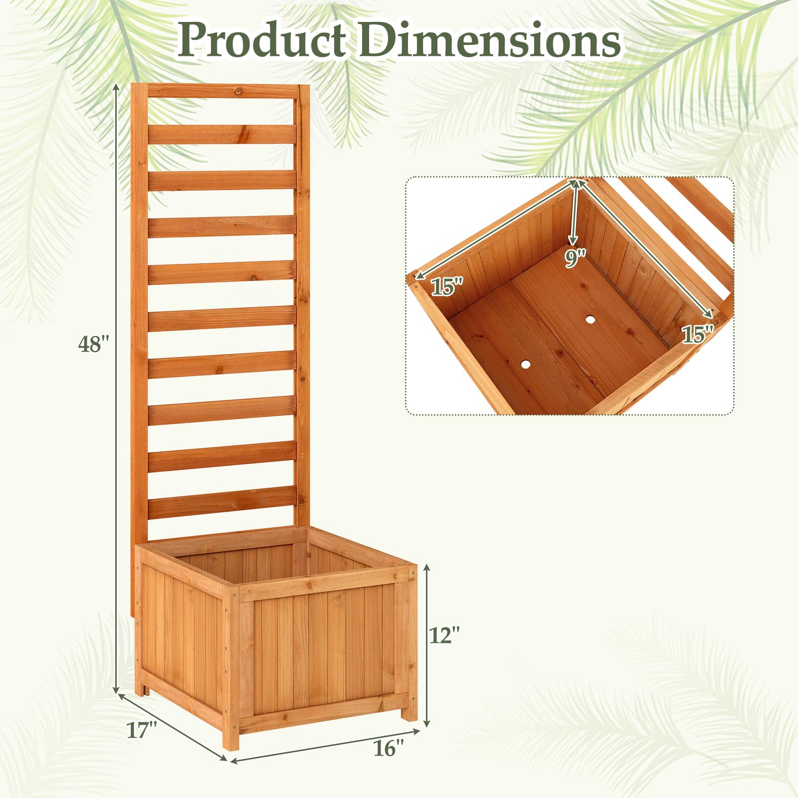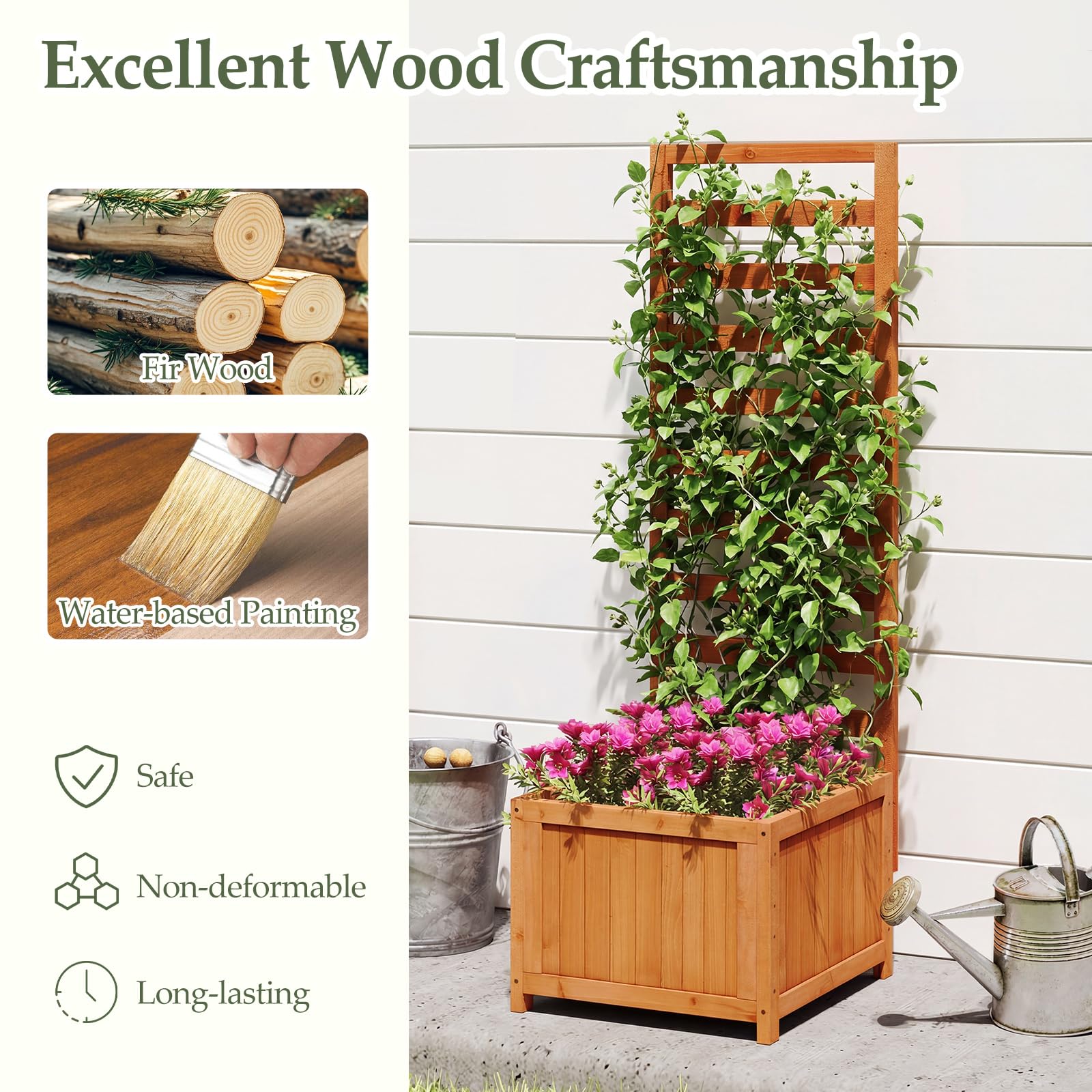 Crafted from sturdy fir wood, it offers a long-lasting planter solution suitable for a variety of plants. Featuring a 2-in-1 multifunctional design, this wood planter box supports climbing plants on its trellis while offering ample space below for flowers, vegetables, and saplings. 2 drainage holes and removable bottom panels ensure proper water flow and prevent overwatering, while the smooth, splinter-free surface enhances both safety and aesthetic appeal. Additionally, this planter doubles as a privacy screen and provides a functional growing area, making it ideal for patios, balconies, and garden corners.