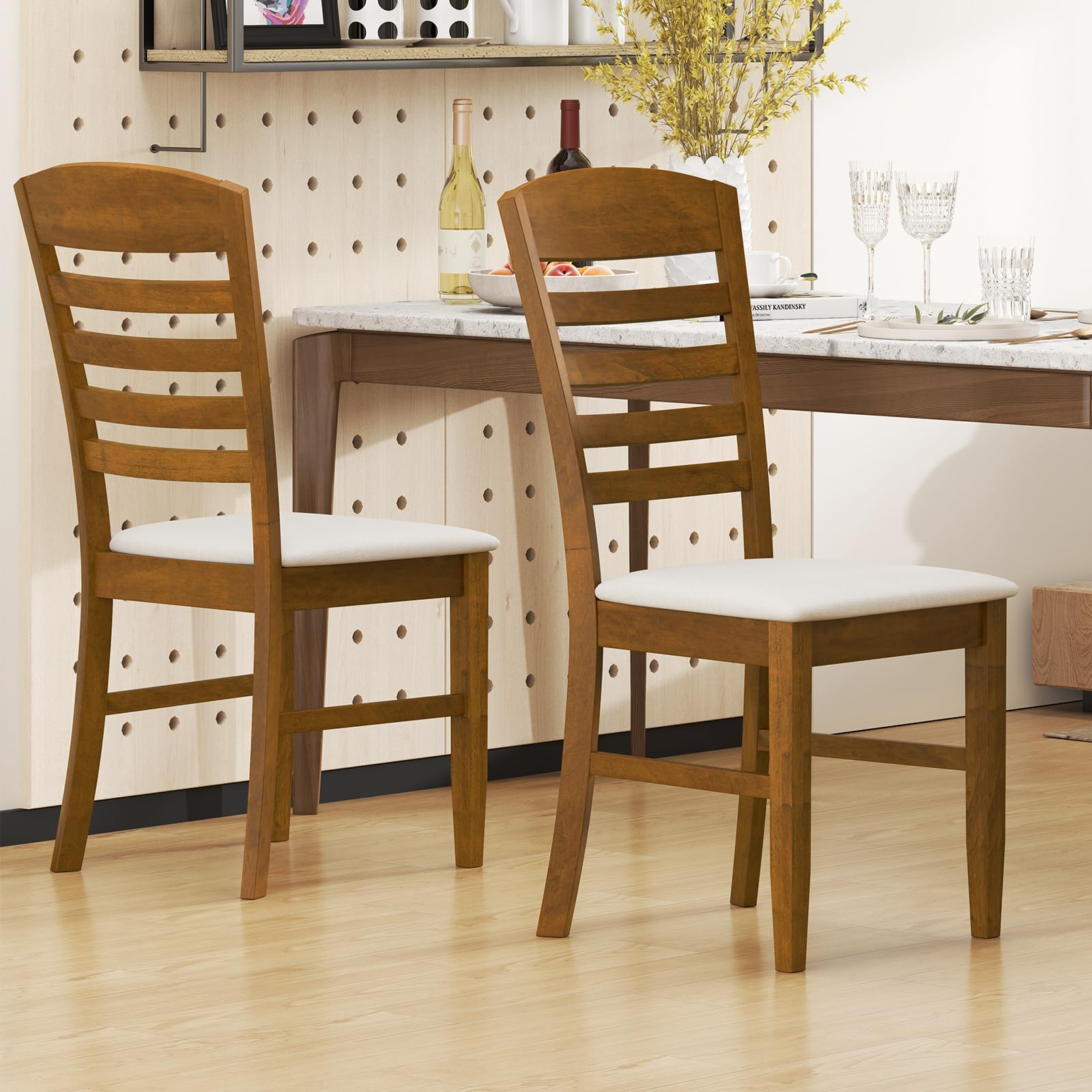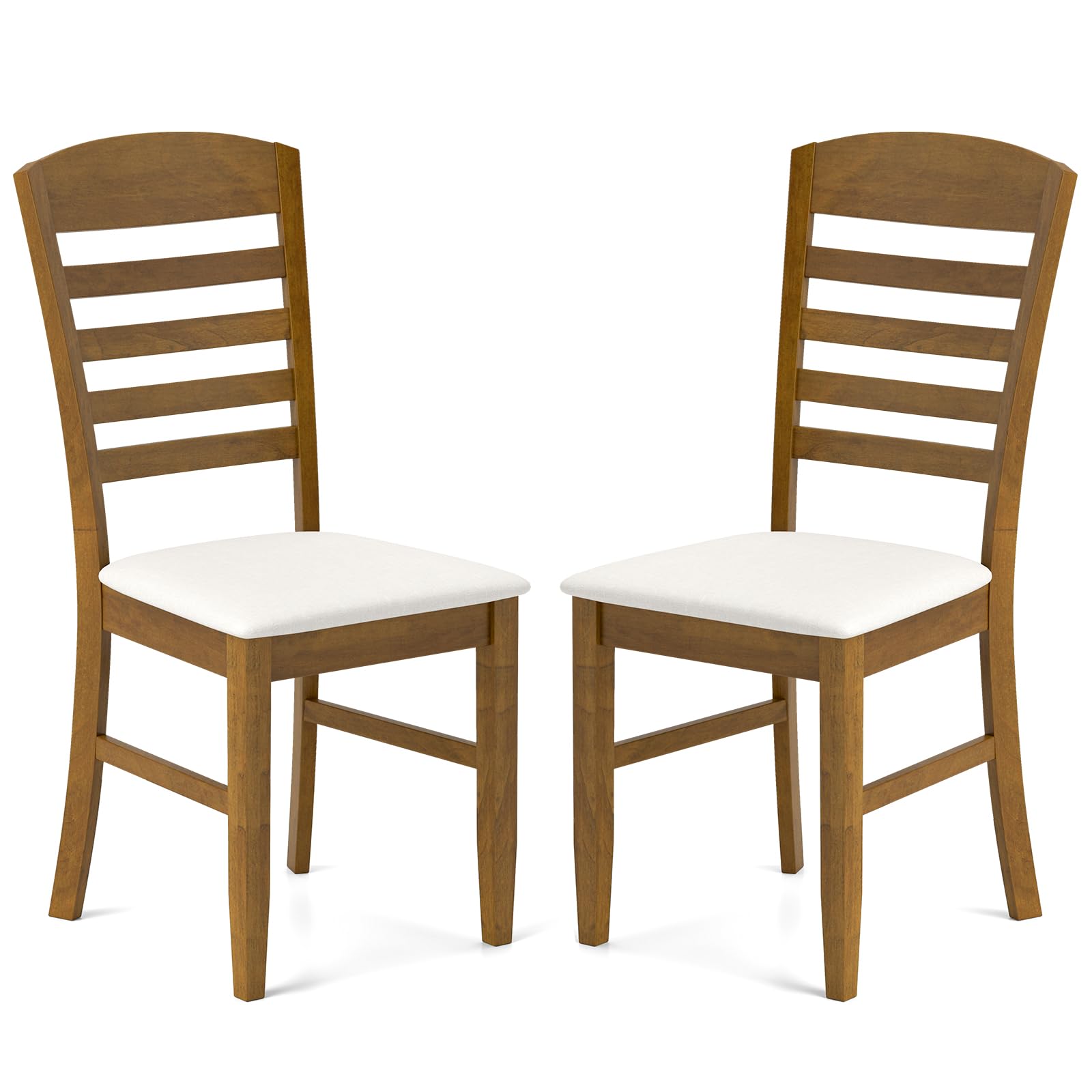 The ergonomic design of our chairs ensures that you can indulge in lengthy dinner conversations without any discomfort. The high backrest provides optimal support for your spine, promoting good posture and enhancing your overall dining experience. The dinette chairs feature anti-fading polyester fabric coverings to add a touch of elegance. Moreover, the upholstered seat features sponge filling to reduce the pressure to your hip. Crafted with a robust rubber wood frame, the kitchen chairs boasts exceptional stability, making them suitable for daily use. Also, the natural wood finish will bring a warm tone to your dining area, such as living room, restaurant, or kitchen.