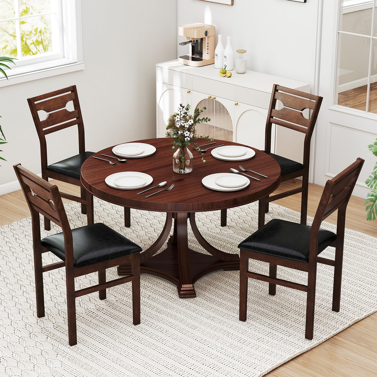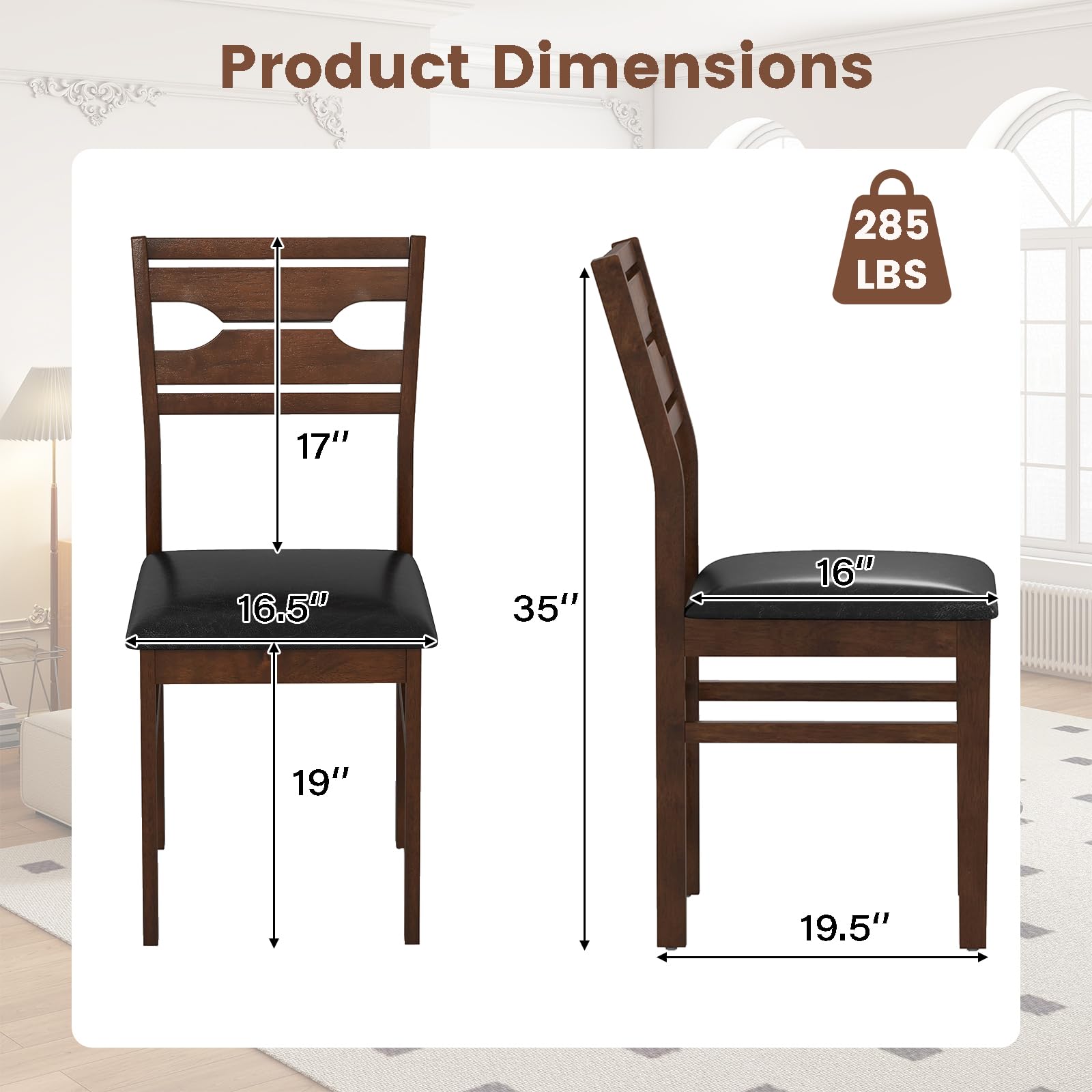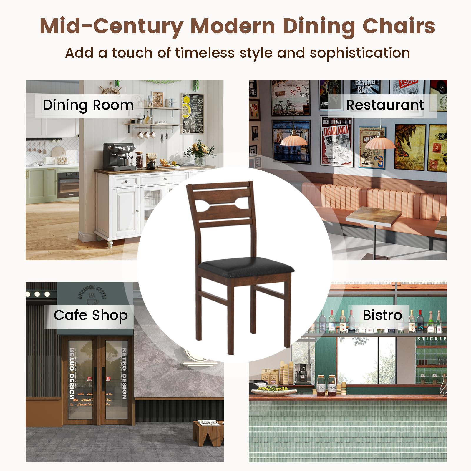Our mid-century modern dining chair set measures 16.5" x 19.5" x 35" (L x W x H), crafted with robust natural rubber wood frames for superior stability and durability. The comfortable padded seats feature premium PU leather upholstery that is easy to clean and stain-resistant, making these chairs perfect for busy households. Designed with an ergonomically curved back, each chair provides optimal support and relaxation during family meals or casual gatherings. The stylish deep brown finish, paired with sleek black leather, creates a timeless look that easily enhances dining rooms, kitchens, or living spaces. Elevate your home with these elegant, functional dining chairs that blend classic charm with modern convenience.
