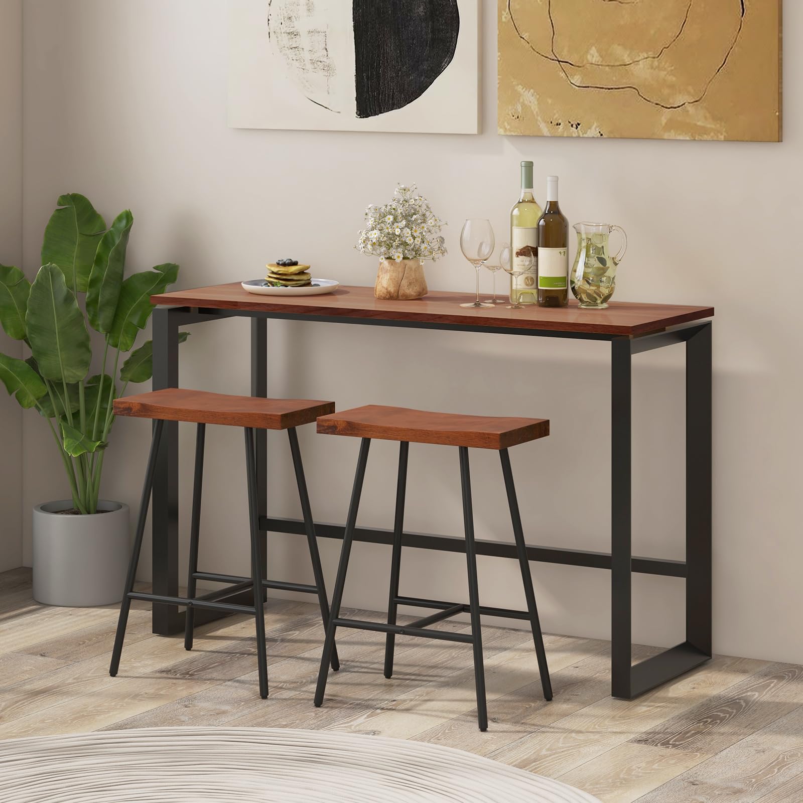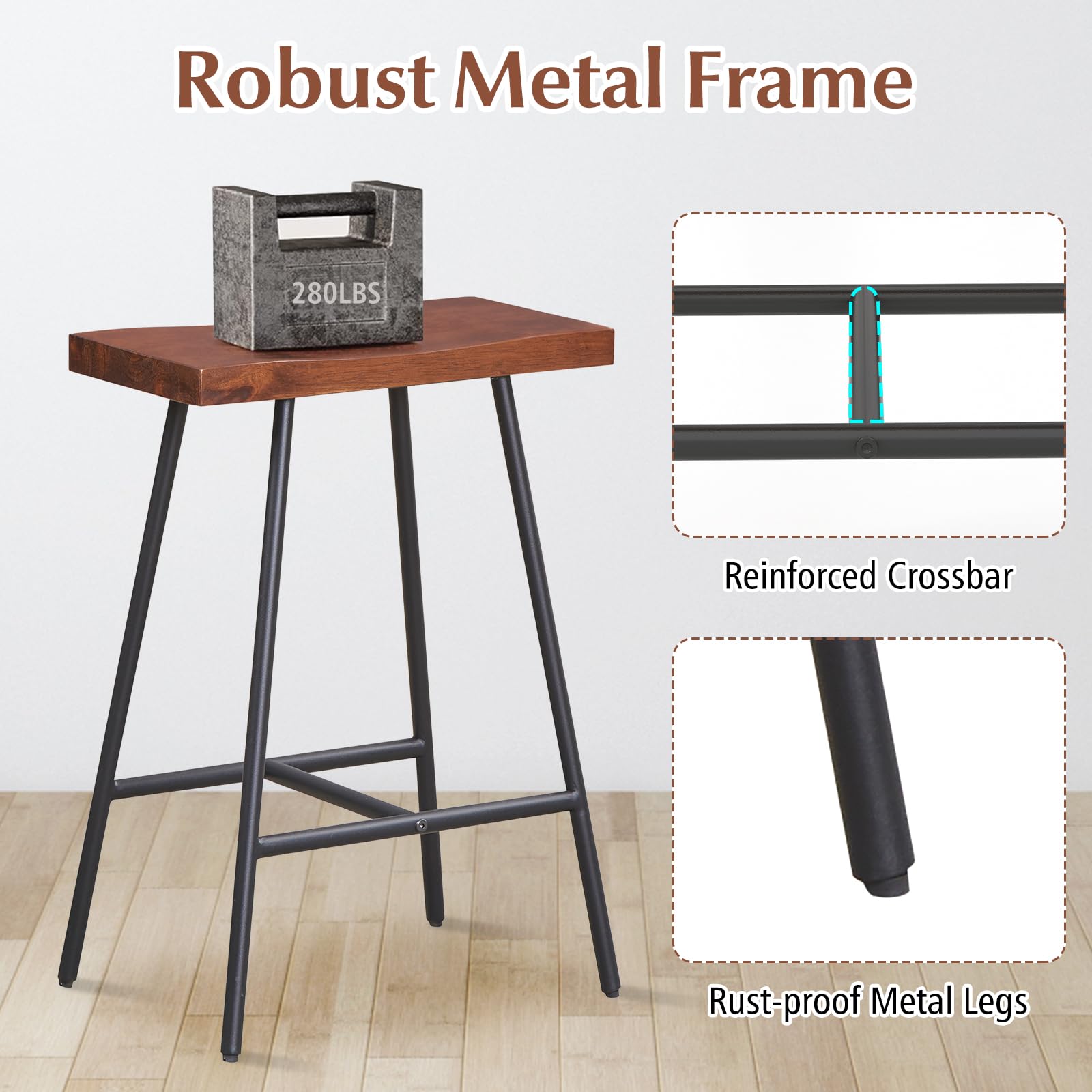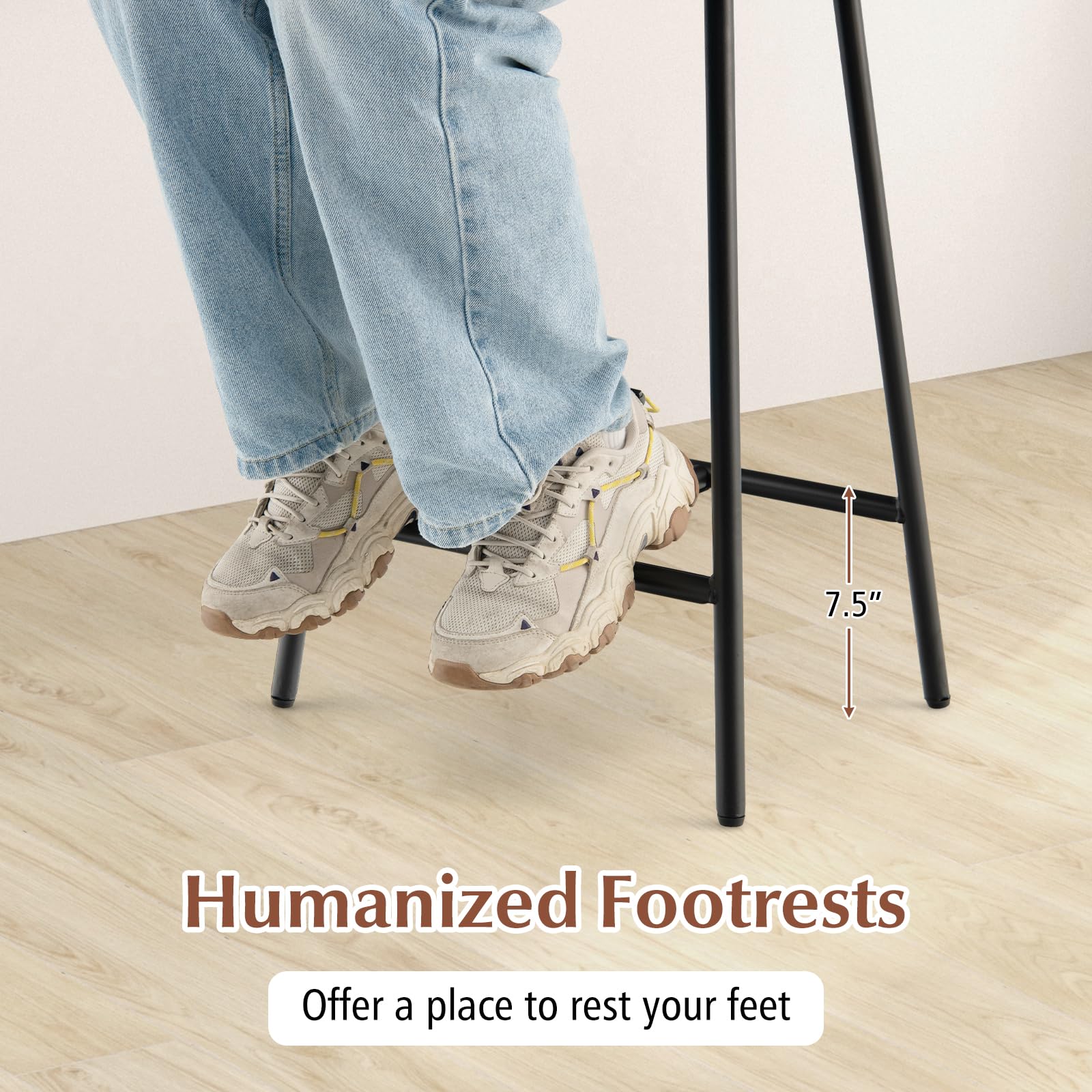 - [Comfortable Saddle Seat Stool] This bar stool is equipped with an ergonomic and curved saddle-styled seat, which perfectly fits your hip curve to reduce fatigue and achieve ultimate comfort. Made of 1.5" thick MDF, the saddle seat is not easy to deform for long-lasting use. Moreover, the 7" high footrest provides a comfy place to rest your feet.