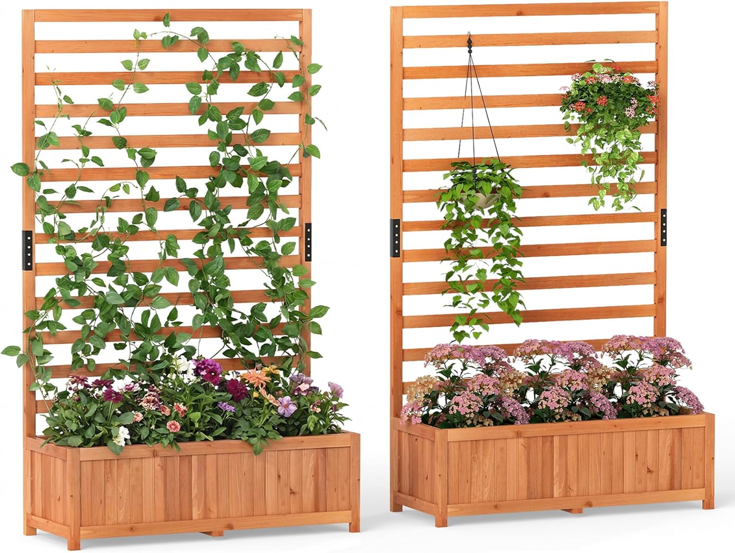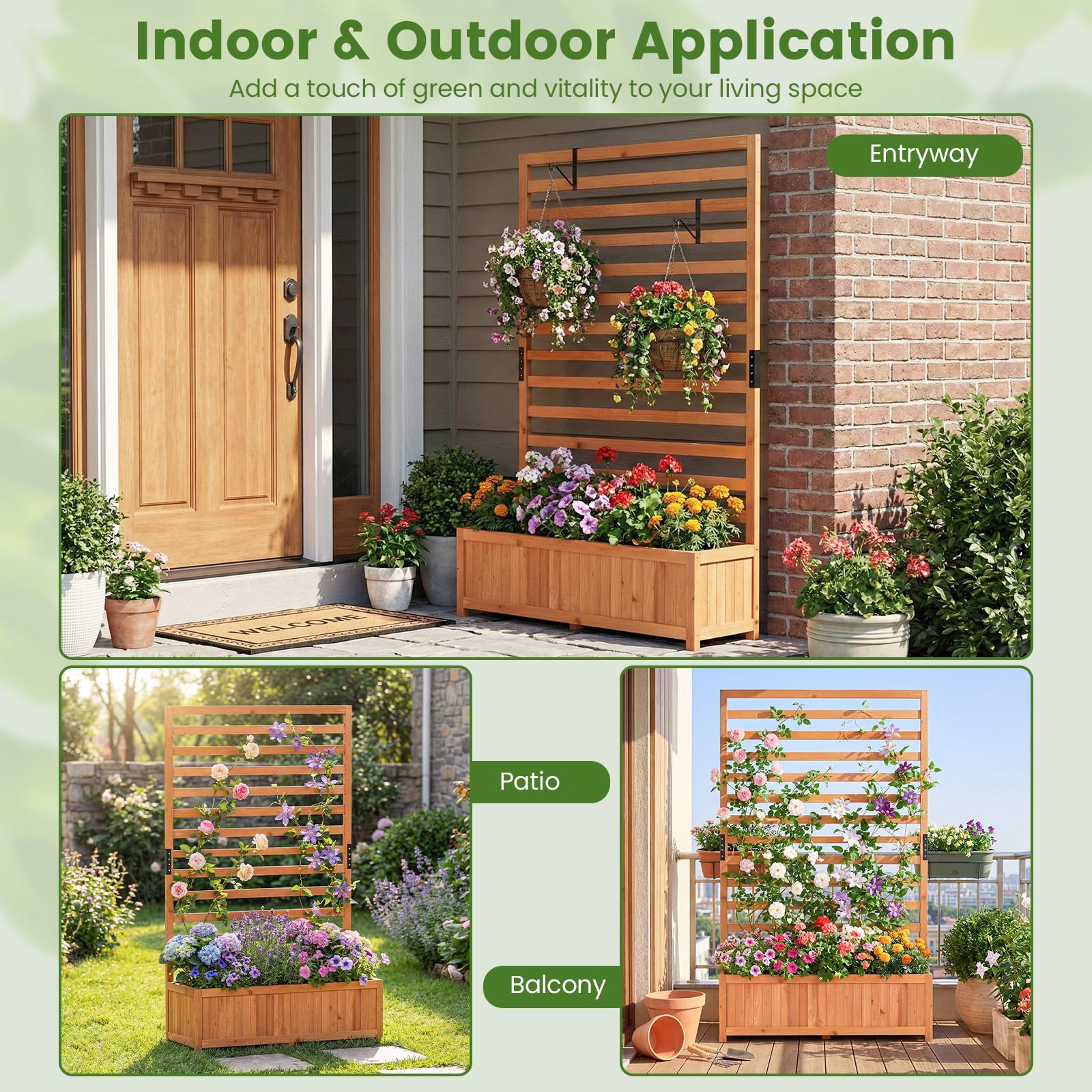 The garden planter box with trellis is thoughtfully crafted from premium fir wood treated with safe water-based paint for lasting durability. The generously sized planter is perfect for cultivating vegetables, herbs, or vibrant flowers, while the included liner ensures optimal drainage and prevents soil spillage. For a versatile touch, remove the liner to transform the flower box into a rustic display for potted plants. The sturdy trellis supports hanging baskets or seasonal decorations, its strength further reinforced by a robust metal bracket. Additionally, the slatted bottom allows excess water to escape, protecting plant roots from overwatering. Also, the detachable base offers adaptable growing space for deep-rooted varieties.